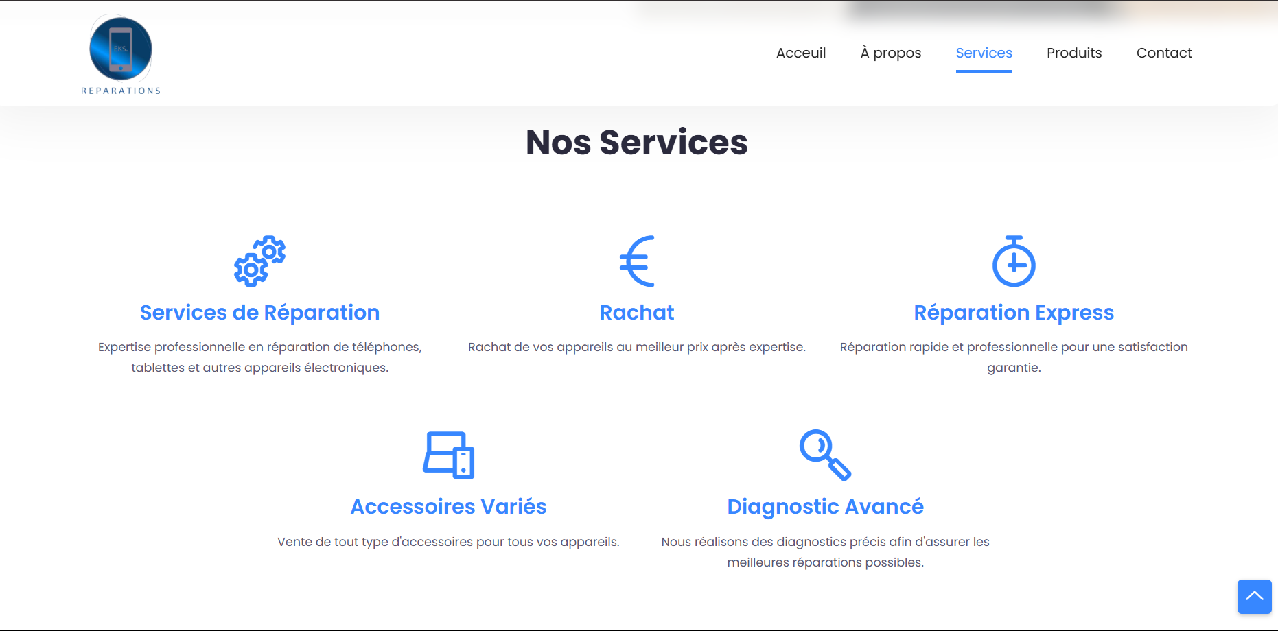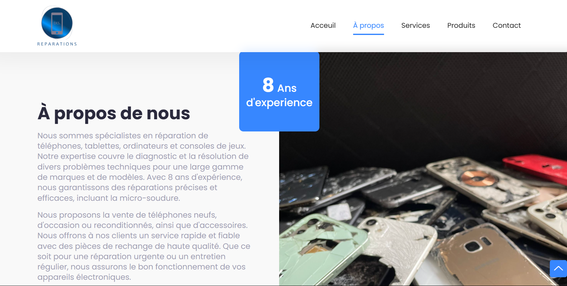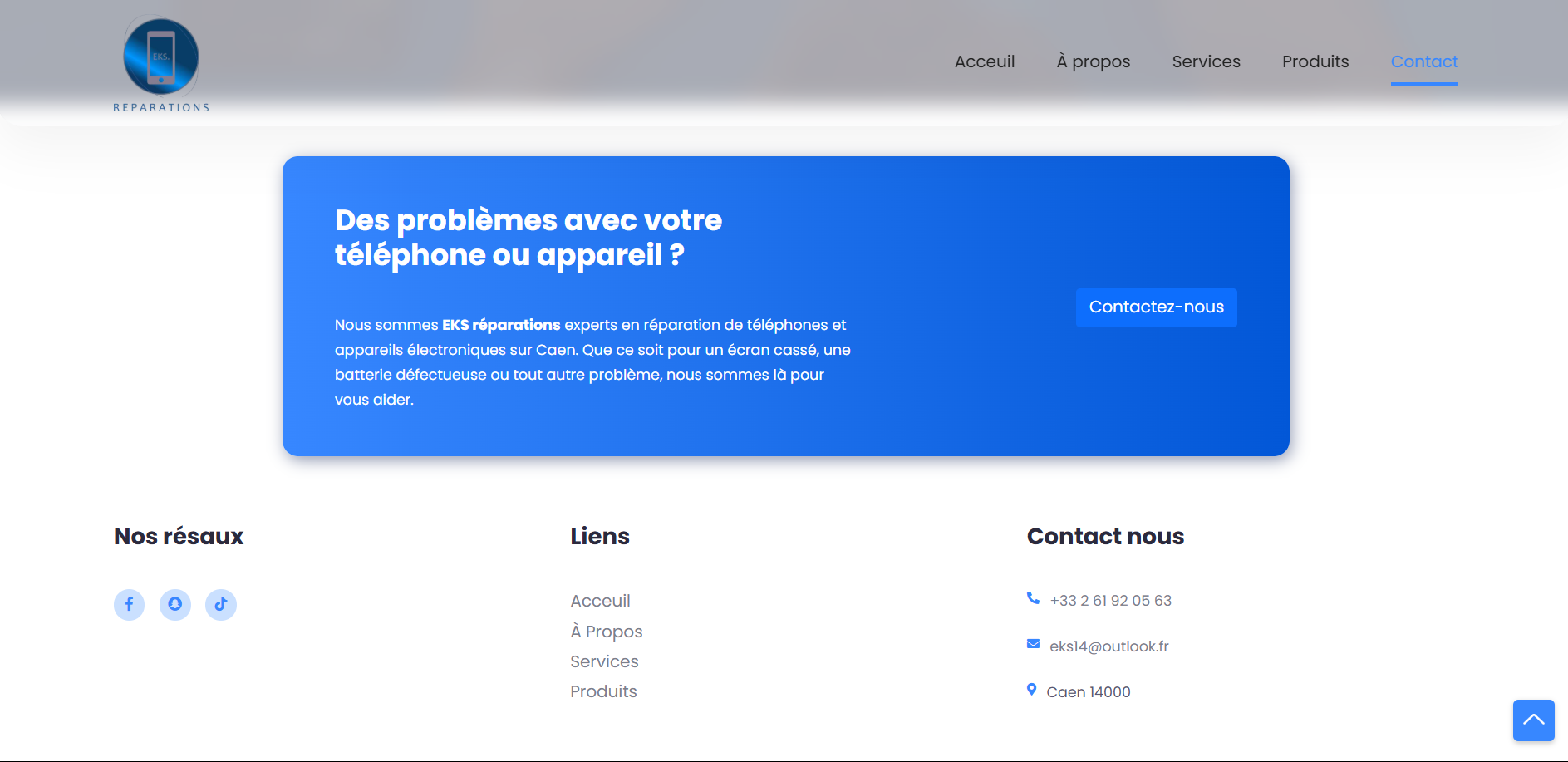 EKS Reparation is a responsive website developed for a phone repair company based in Caen, France. This freelance project showcases the company's repair services, featuring an intuitive user interface built with HTML, CSS, JavaScript, and Bootstrap. The website provides customers with easy access to information about repair services, pricing, and booking options.