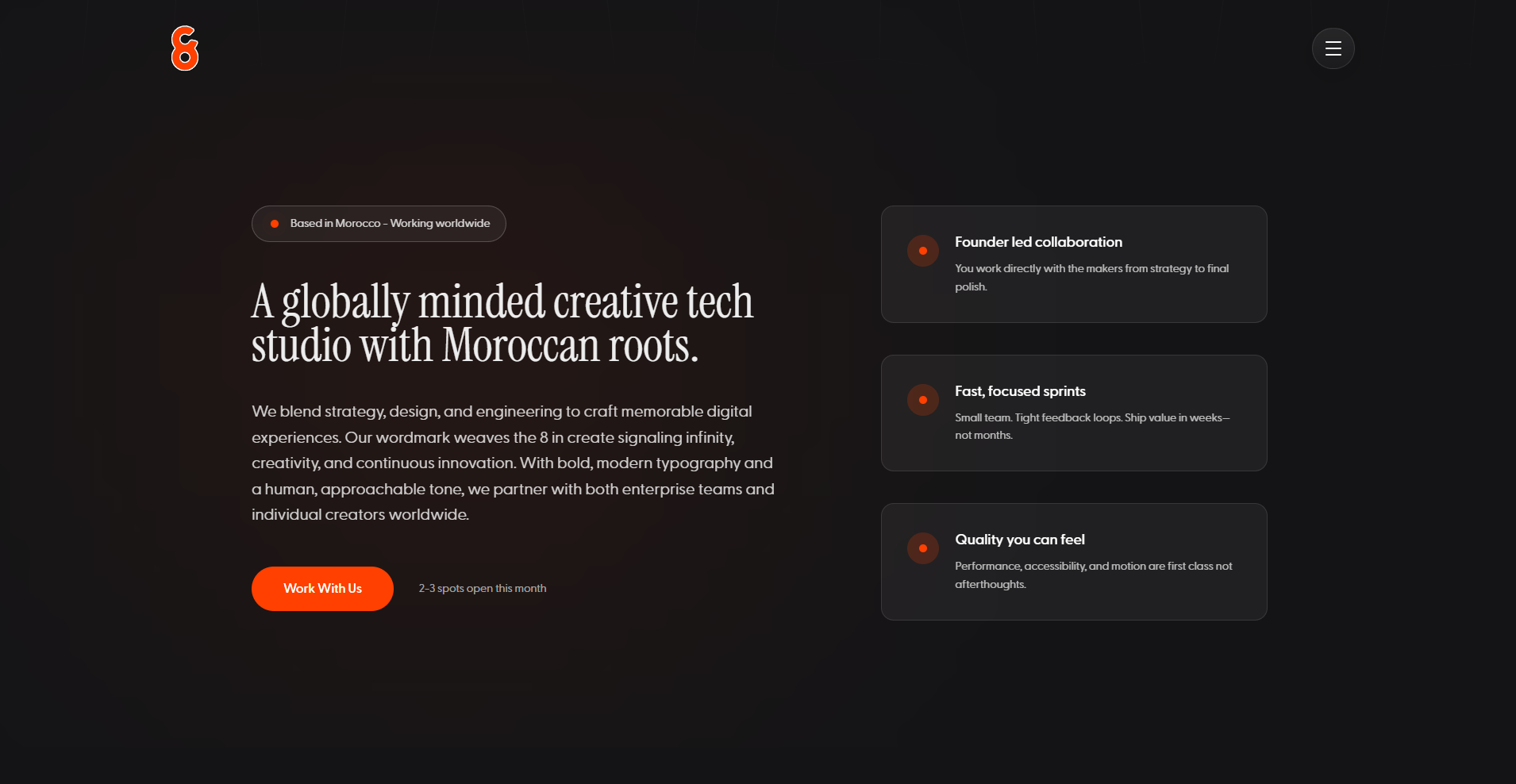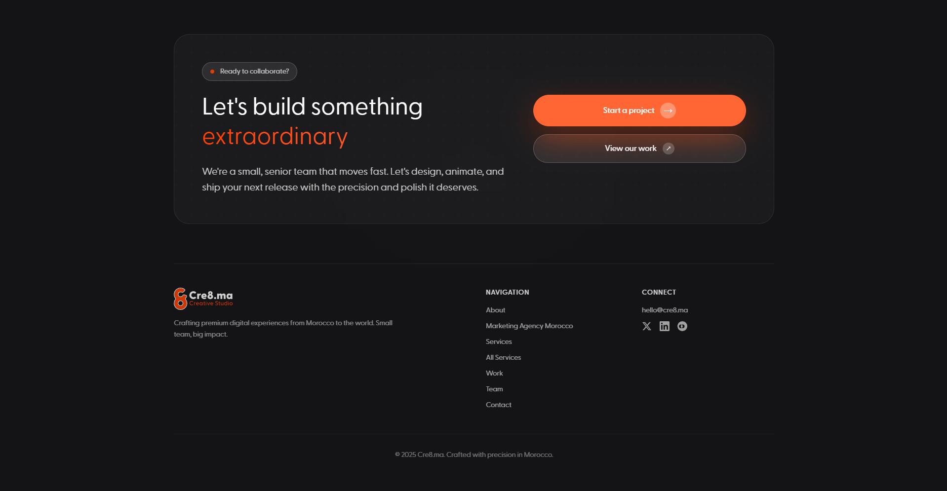 Cre8.ma is my personal creative and marketing agency based in Morocco, serving clients worldwide. We specialize in building digital brand identities, visual systems, and online presence that help people and businesses stand out. Our slogan: "we build digital, you build Legacy" reflects our mission to craft durable digital foundations while empowering clients to own their success.